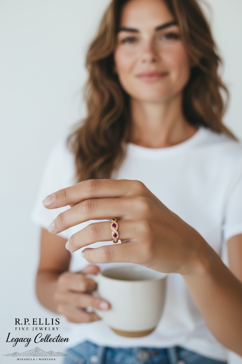 Design: Fluid wave-inspired silhouette with alternating ruby and diamond accent