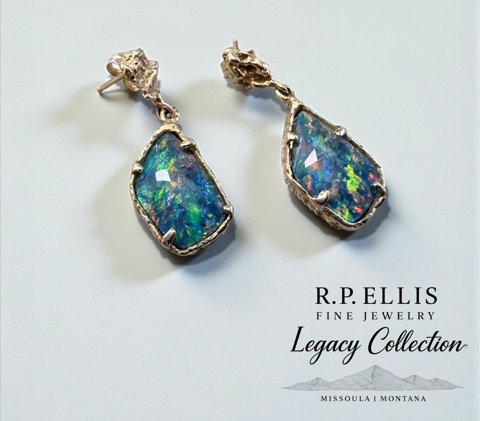 A striking pair of freeform fire opals, alive with vibrant flashes of red, green, blue, and gold. Set in substantial 14K yellow gold, each stone is framed in a sculptural prong setting that mirrors its natural shape